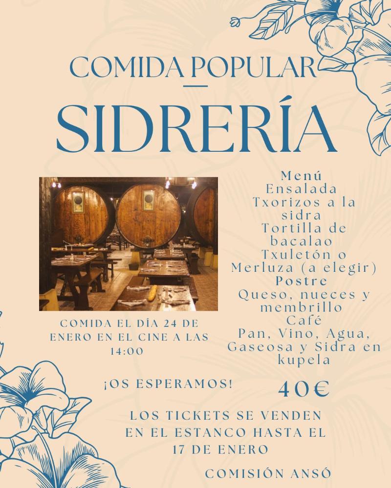 - 14h Comida popular. Menú sidrería a cargo de Sagardotegi Ibilitaria en el cine, con concierto café a cargo de la Charanga os Mozés.