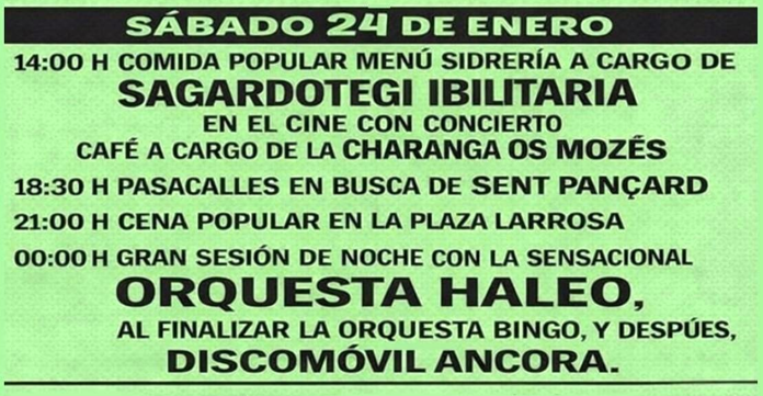 14h Comida popular con menú sidrería a cargo de Sagardotegi Ibilitaria, amenizada con concierto. Lugar, en el cine. Café a cargo de las Charanga Os Mozés.