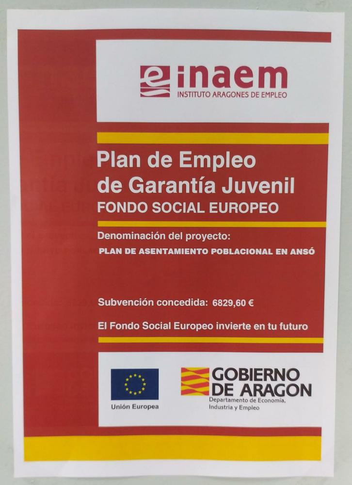 El Ayuntamiento de Ansó es beneficiario de una subvención por importe de 6.829,60 € otorgada dentro del Plan de Empleo de Garantía Juvenil del Instituto Aragonés de Empleo, promovido y financiado por el Fondo Social Europeo en coordinación con el Gobierno de Aragón, destinada a la contratación de una persona joven menor de 30 años como figura de Agente de Desarrollo Local.